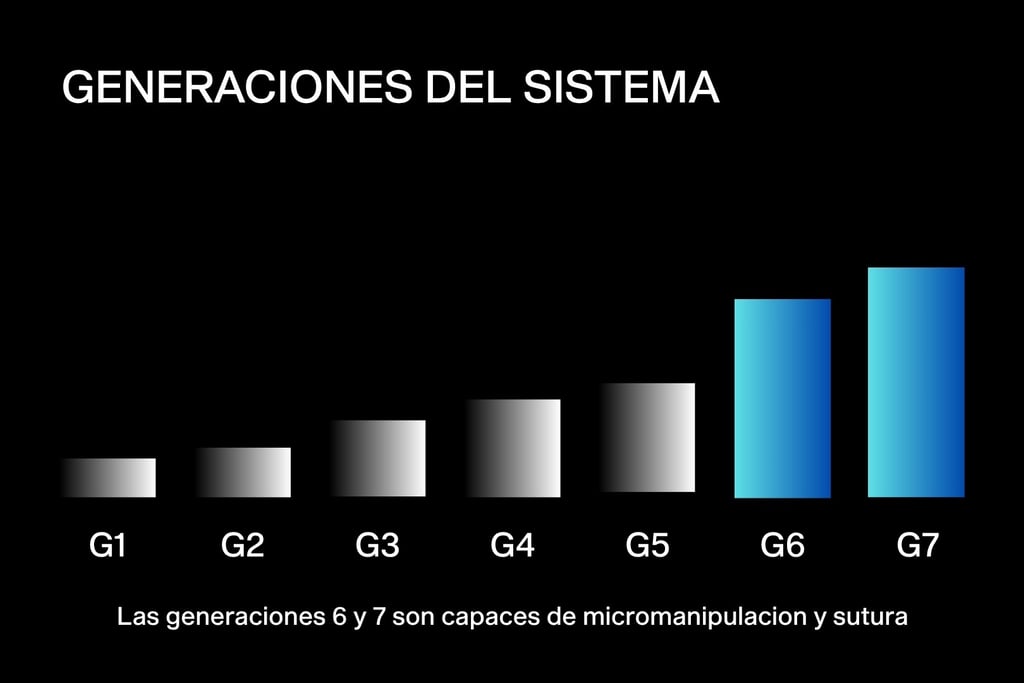 Las generaciones sexta y séptima representan un salto cualitativo: incorporan capacidades para realizar suturas con mayor exactitud y control, acercando el sistema a aplicaciones más complejas y especializadas. Ya no es solo un experimento. Es una plataforma tecnológica en consolidación.