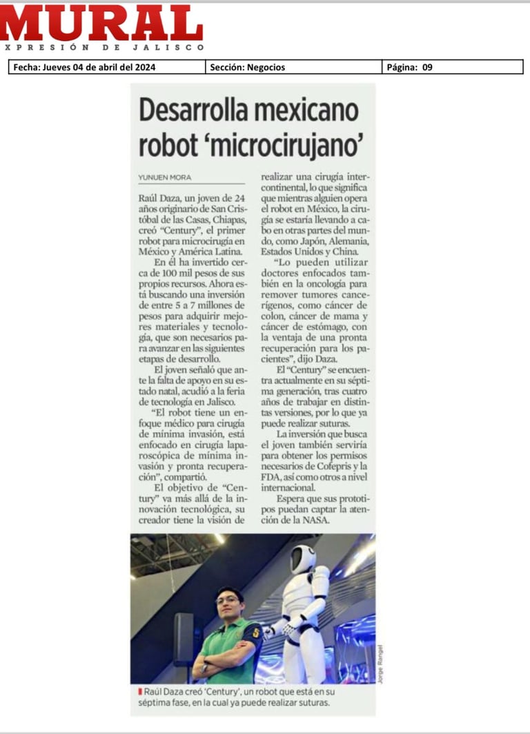 Century representa una nueva generación de robótica de precisión desarrollada en México, combinando ingeniería, visión tecnológica y un enfoque hacia el futuro de la teleoperación y la microprecisión. Iniciando en Chiapas, desarrollado en Jalisco para el pueblo de México, y de México para el mundo.